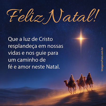 Mensagem com frase de Natal com imagem dos três Reis Magos seguindo a estrela de Natal no deserto para encontrar o Menino Jesus. Veja a frase” “Que a luz de Cristo resplandeça em nossas vidas e nos guie para um caminho de fé e amor neste Natal. Feliz Natal!” Clique na imagem para ampliar e