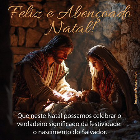 Mensagem com frase de Feliz Natal Abençoado com foto Realista de José, Maria e o Menino Jesus na manjedoura. Veja a frase: “Que neste Natal possamos celebrar o verdadeiro significado da festividade: o nascimento do Salvador. Feliz e abençoado Natal!” Clique na imagem para ampliar e baixar: Formato: 1600 px por 1600 px Arquivo: PNG,