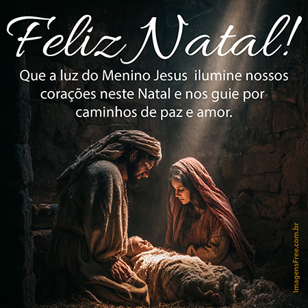 Mensagem de Natal católica com foto de José, Maria e o Menino Jesus deitado em sua manjedoura. Uma luz desce do teto e ilumina o Menino Jesus de forma dramática e espiritual. A frase é sobre a luz do Menino Jesus. Veja a frase: Que a luz do Menino Jesus ilumine nossos corações neste Natal