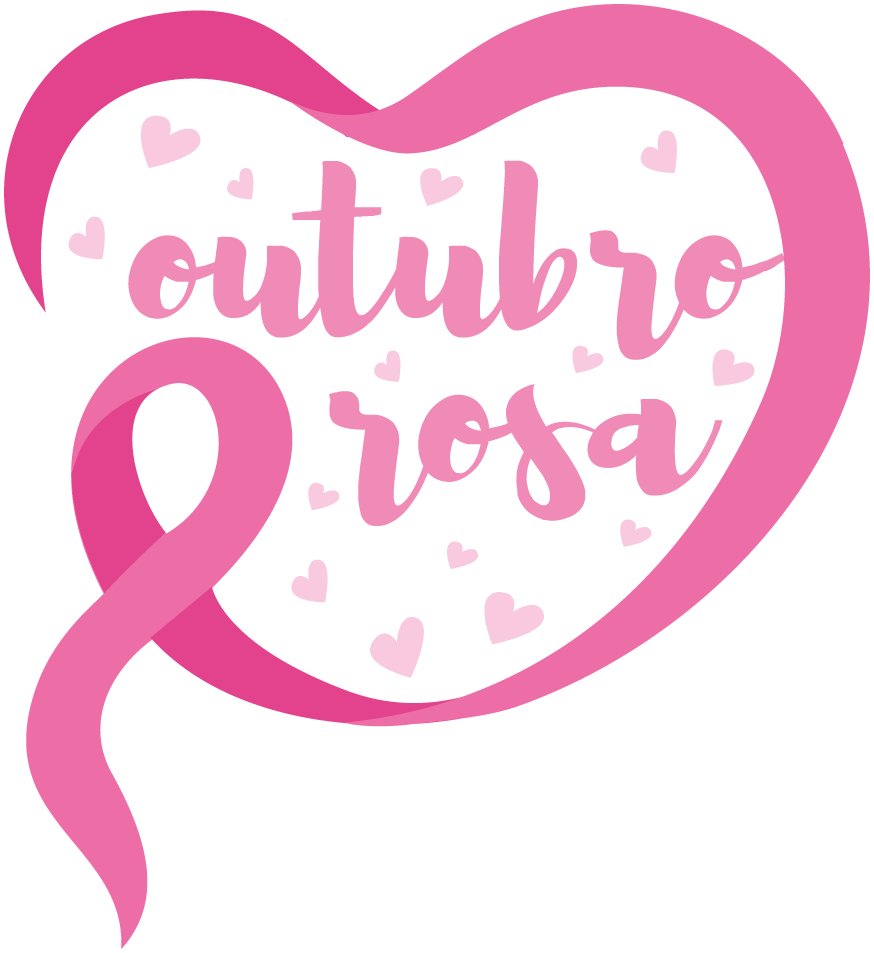 Arte de estampa de caneca com laço e frase Outubro Rosa formando um coração em PNG. Ilustração de laço Outubro Rosa cuja fita forma o desenho de um coração e envolve as palavras “Outubro Rosa”. Ao fundo, há pequenos corações rosas.