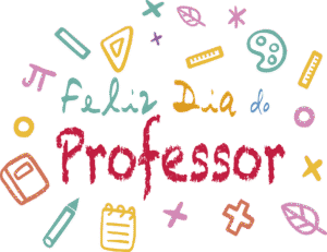 Estampa para caneca com a frase “Feliz Dia do Professor” e ícones de material escolar.