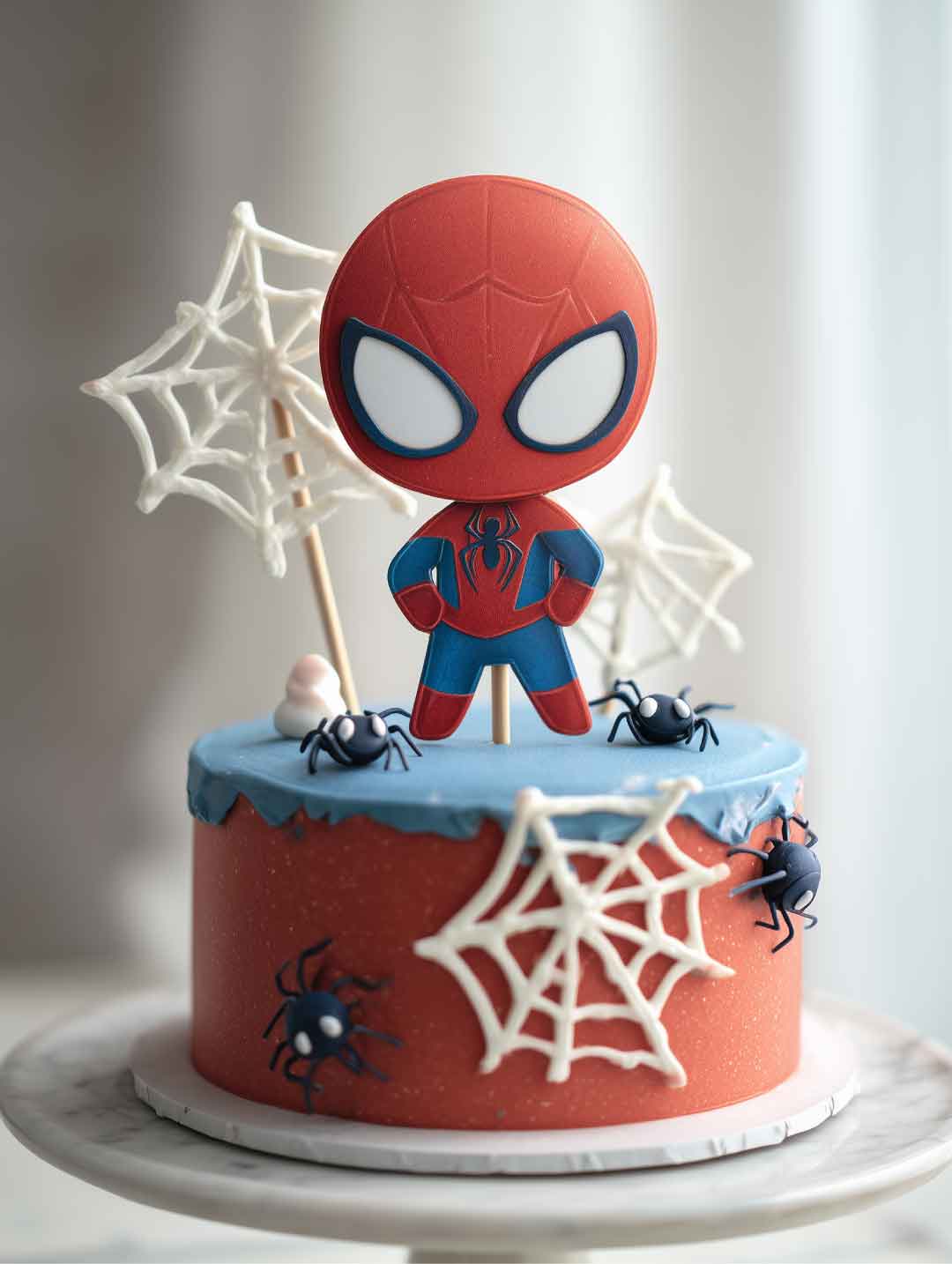 Ideia 1: Bolo do Super-Herói Aranha com topper de teia e o personagem.