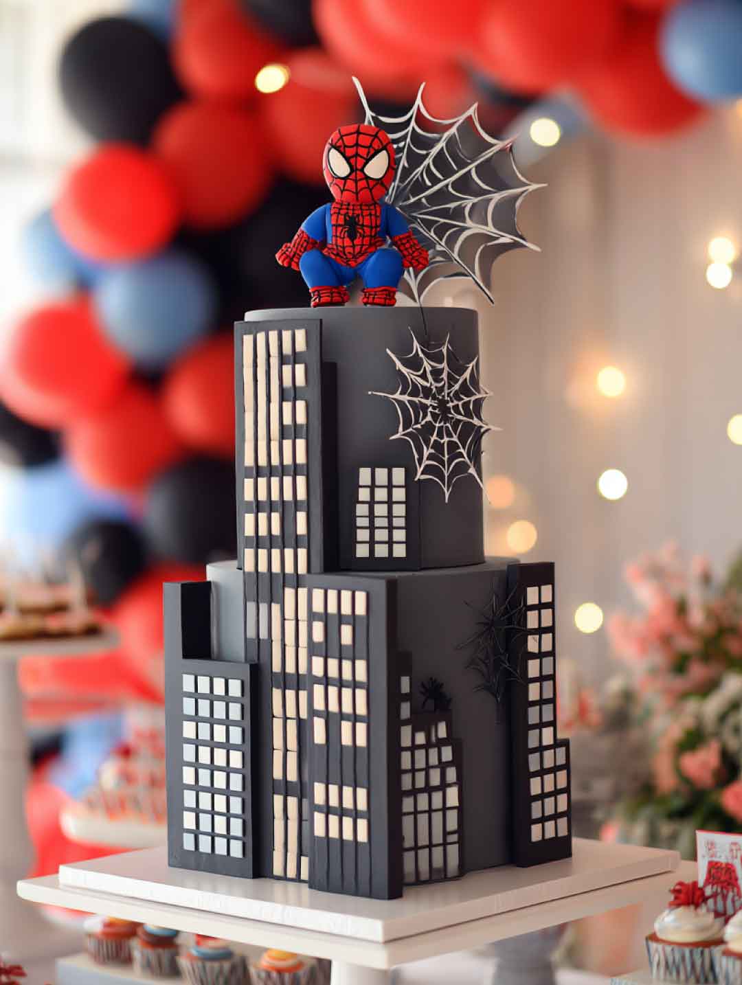 Ideia 2: Bolo do Menino Aranha com prédios.