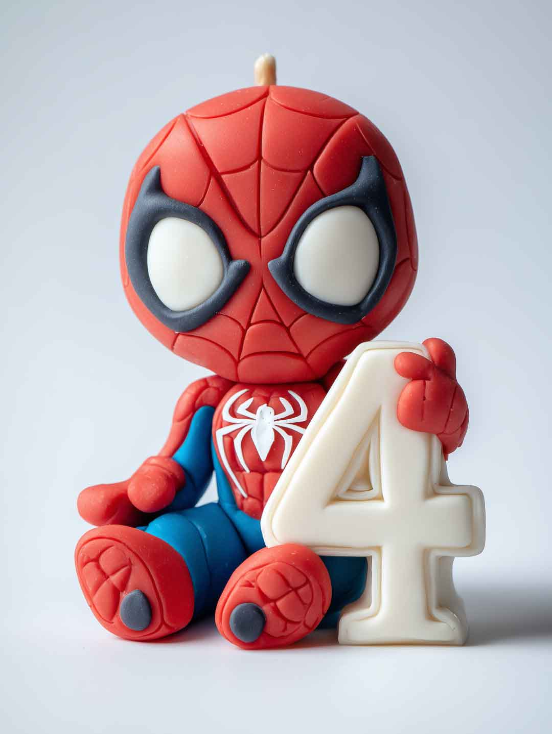 Topo de bolo super-herói com vela e menino-aranha de biscuit