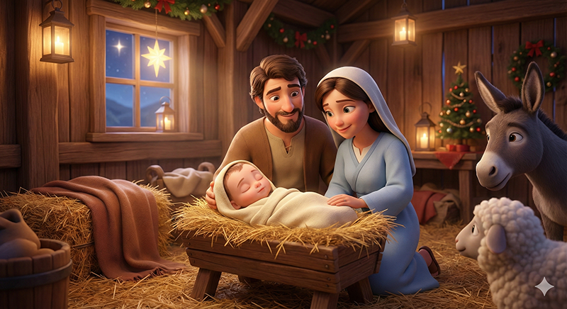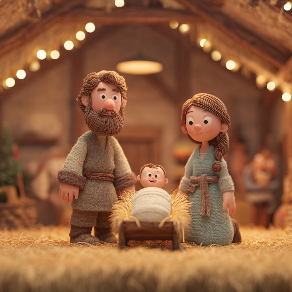 Christmas nativity scene in Pixar-inspired 3D style, baby in a manger, loving parents beside him, soft and friendly character design, warm lighting, cozy barn setting, subtle Christmas atmosphere, gentle expressions, cinematic depth of field, pastel tones, wholesome family scene, ultra detailed