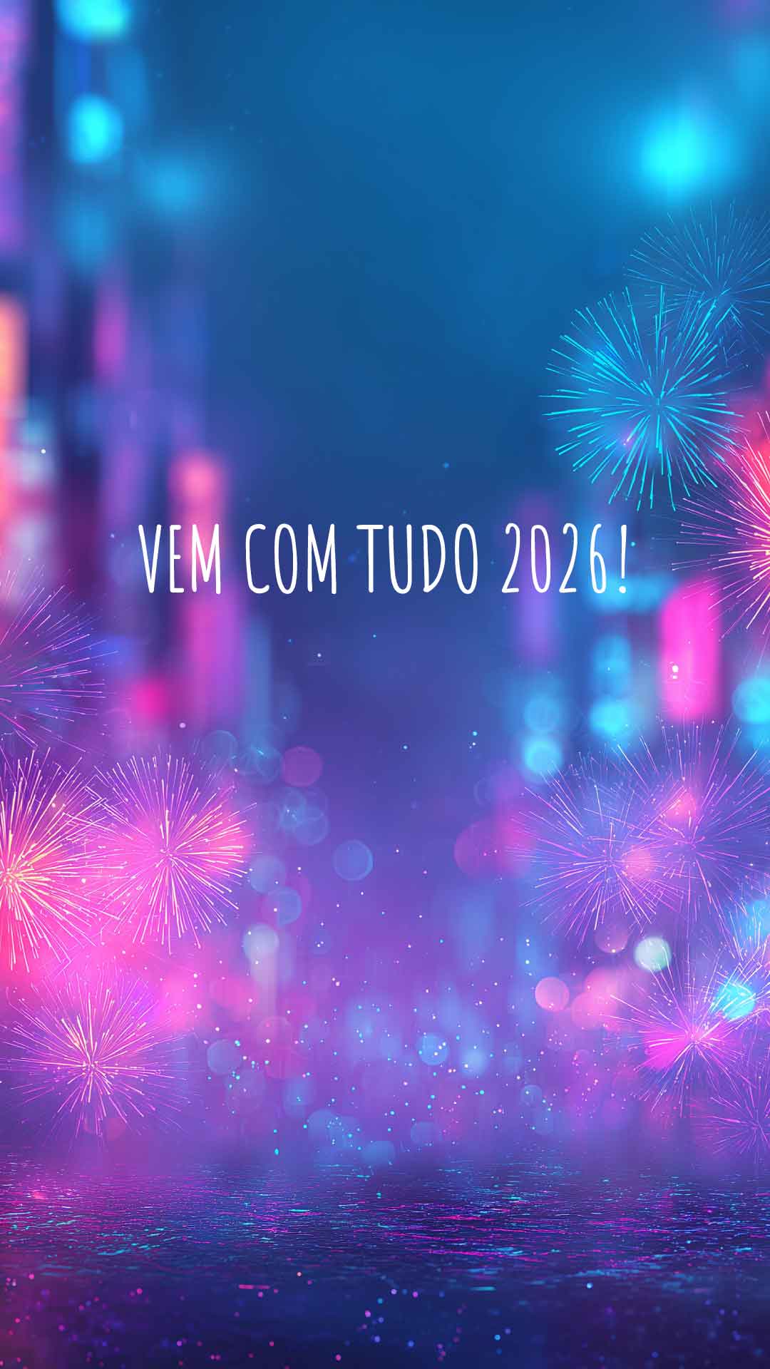 Mensagem de Ano Novo 2026 com visual jovem e moderno para WhatsApp. Imagem vibrante, estilo cyberpunk, para jovens. Frase curta: “Vem com tudo 2026!”. Clique na imagem abaixo para ampliar e baixar: