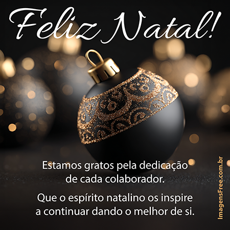 Mensagem de Natal para Funcionários. A mensagem é uma linda foto de bolinhas de Natal na cor preta e dourada que transmitem sofisticação. A frase de fim de ano é de agradecimento aos funcionários e colaboradores.