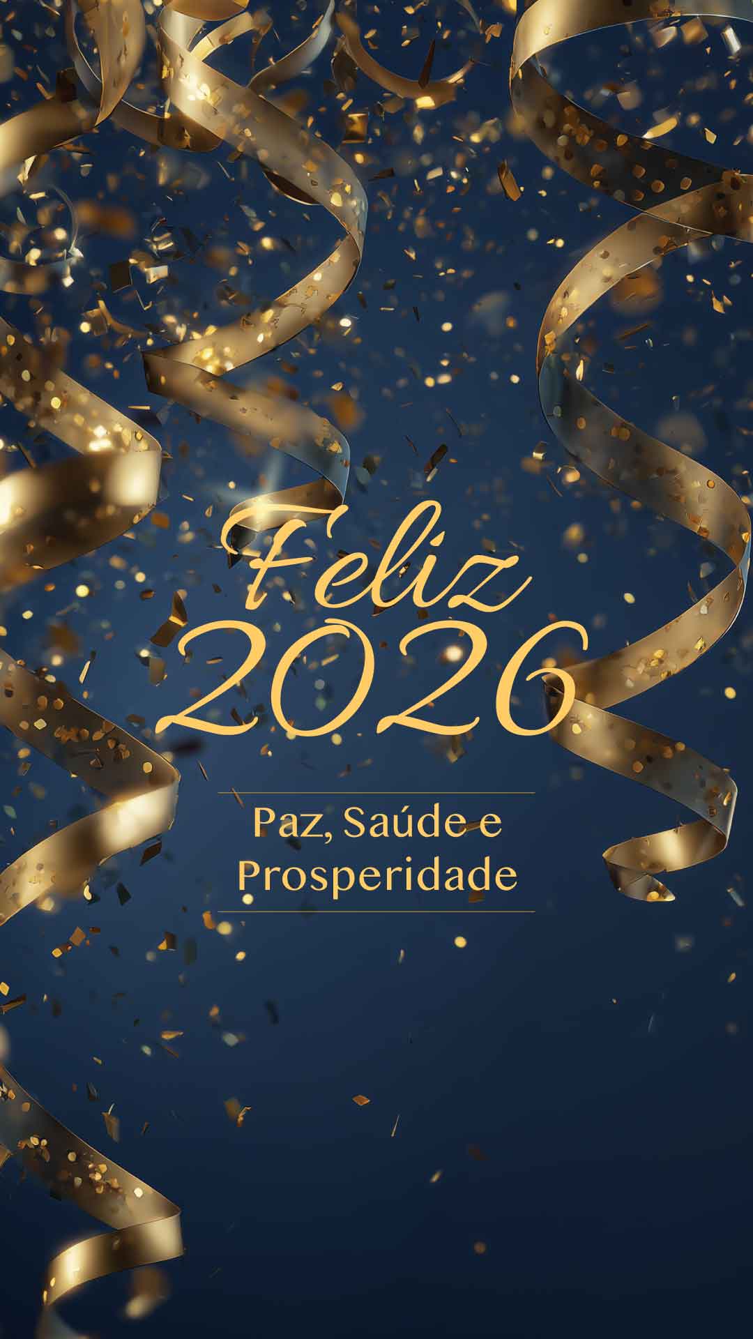 Mensagem de Feliz 2026 para WhatsApp com imagem de serpentinas e confetes dourados.Frase “Paz, Saúde e Prosperidade. Feliz 2026!”.Clique na imagem abaixo para ampliar e baixar.