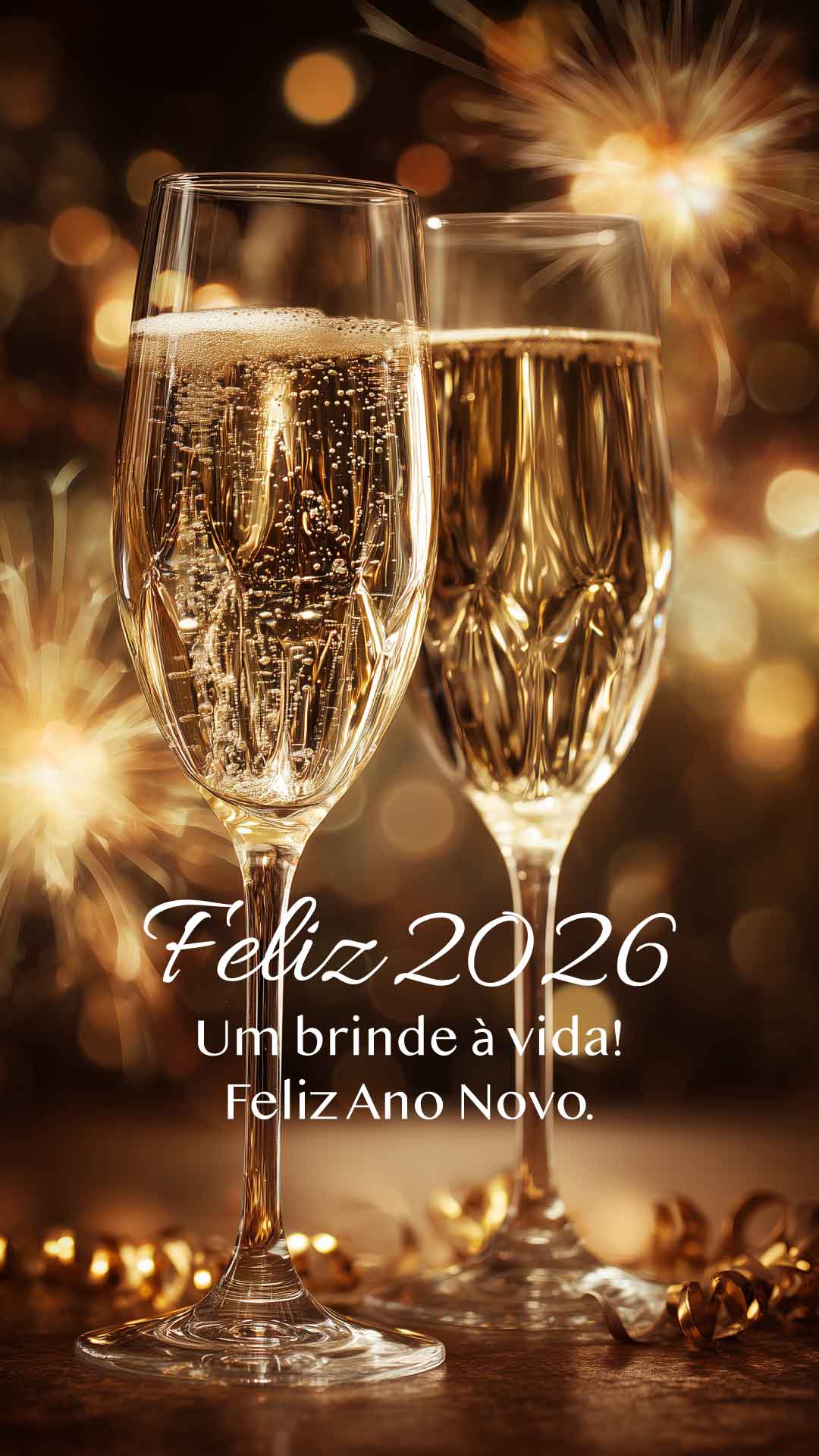 Mensagens de Feliz Ano Novo 2026 elegante com taças de champanhe com a frase “Feliz 2026! Um brinde à vida. Feliz Ano Novo!” Mensagem com imagem no formato ideal para WhatsApp e Stories do Instagram. Clique na imagem abaixo para ampliar e baixar.